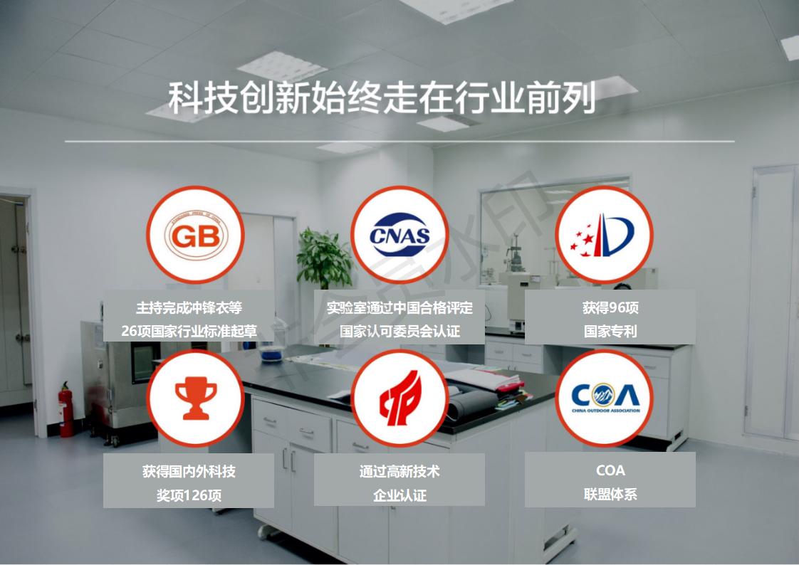 公司聚焦核心科技,强化融合创新,注重成果转化,坚持“深入科技研究、整合优势资源、打造科技平台”的科研方向。自公司成立以来,获得国内外行业科技、研发和设计奖项共计126项,其中包括中国纺织工业联合会科学技术进步奖、全球体育及户外用品博览会(ISPO)设计奖、全球体育及户外用品博览会(ISPO)功能性纺织品趋势大奖等奖项;同时公司积极参与国行标准起草26项,其中GB/T 32614-2016 户外运动服装冲锋衣国家标准制定,获得中国纺织工业联合会科学技术进步奖。